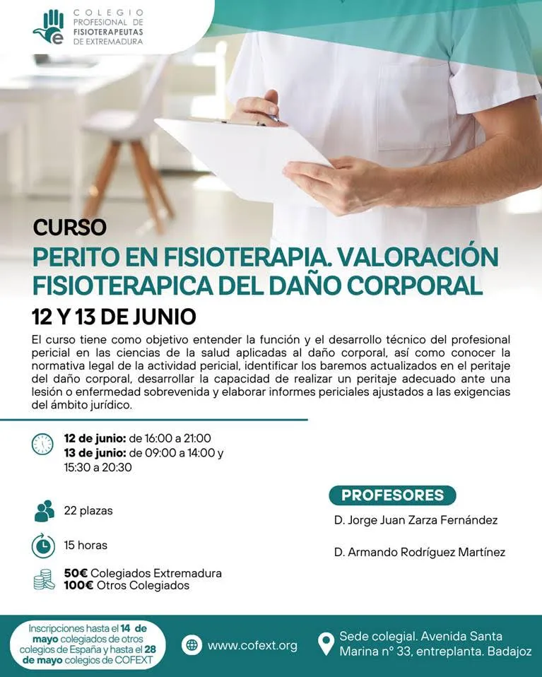 Les remitimos la información sobre el Curso: “Perito en fisioterapia. Valoración fisioterápica del daño corporal”, organizado por el Colegio de Fisioterapeutas de Extremadura para que podáis difundirlo al resto de colegios.